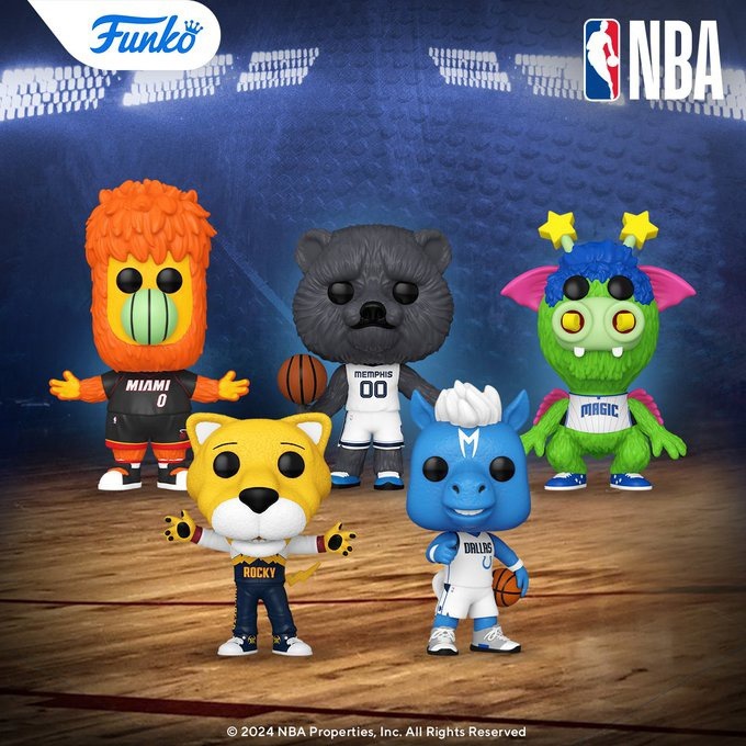 Funko Pop! collectors and NBA fans can now look forward to five newly announced NBA Basketball Mascots Funko Pop! vinyl figures, including Champ the Horse (Dallas Mavericks), Burnie the Fireball (Miami Heat), Rocky the Mountain Lion (Denver Nuggets), Grizz the Bear (Memphis Grizzlies) and Stuff the Magic Dragon (Orlando Magic).